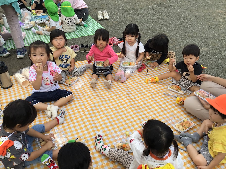 ゲーム遊びや砂遊びを楽しんだ後、給食さんが作ってくれたお弁当をみんなで食べました!