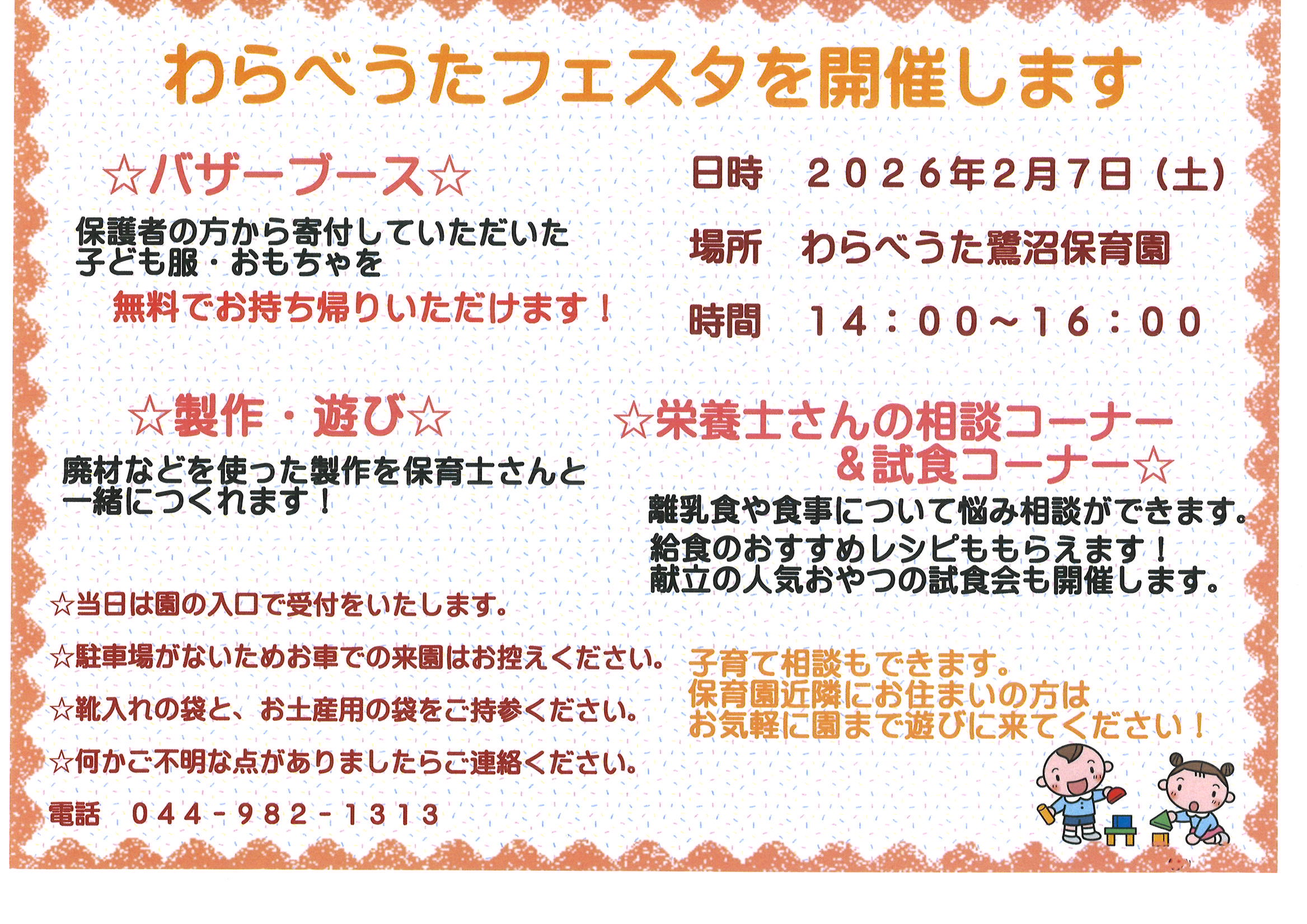 時間 14:00~16:00保育園内を開放してイベントを行ないます。