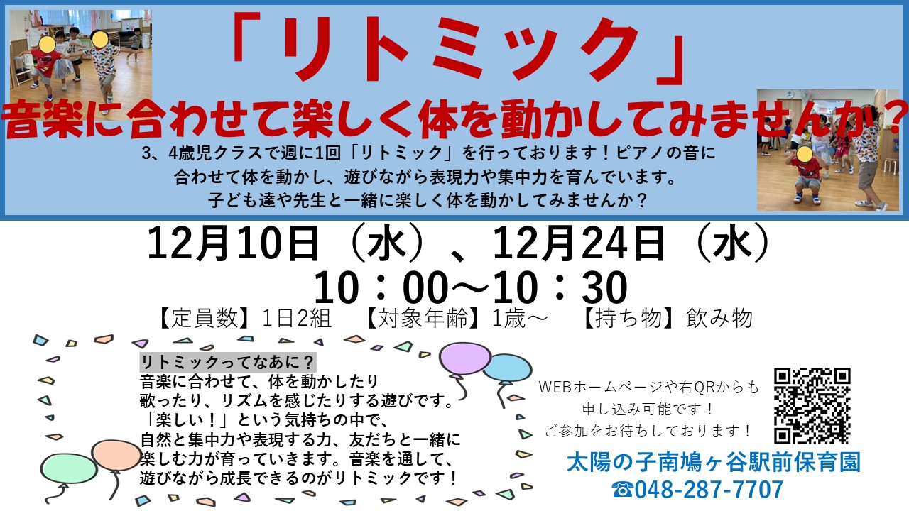 12月10日(水)12月24日(水)の活動内容です。3・4歳児の運動遊びです。1歳以上のお子様を募集しております。飲み物をご持参ください!ご応募お待ちしています。