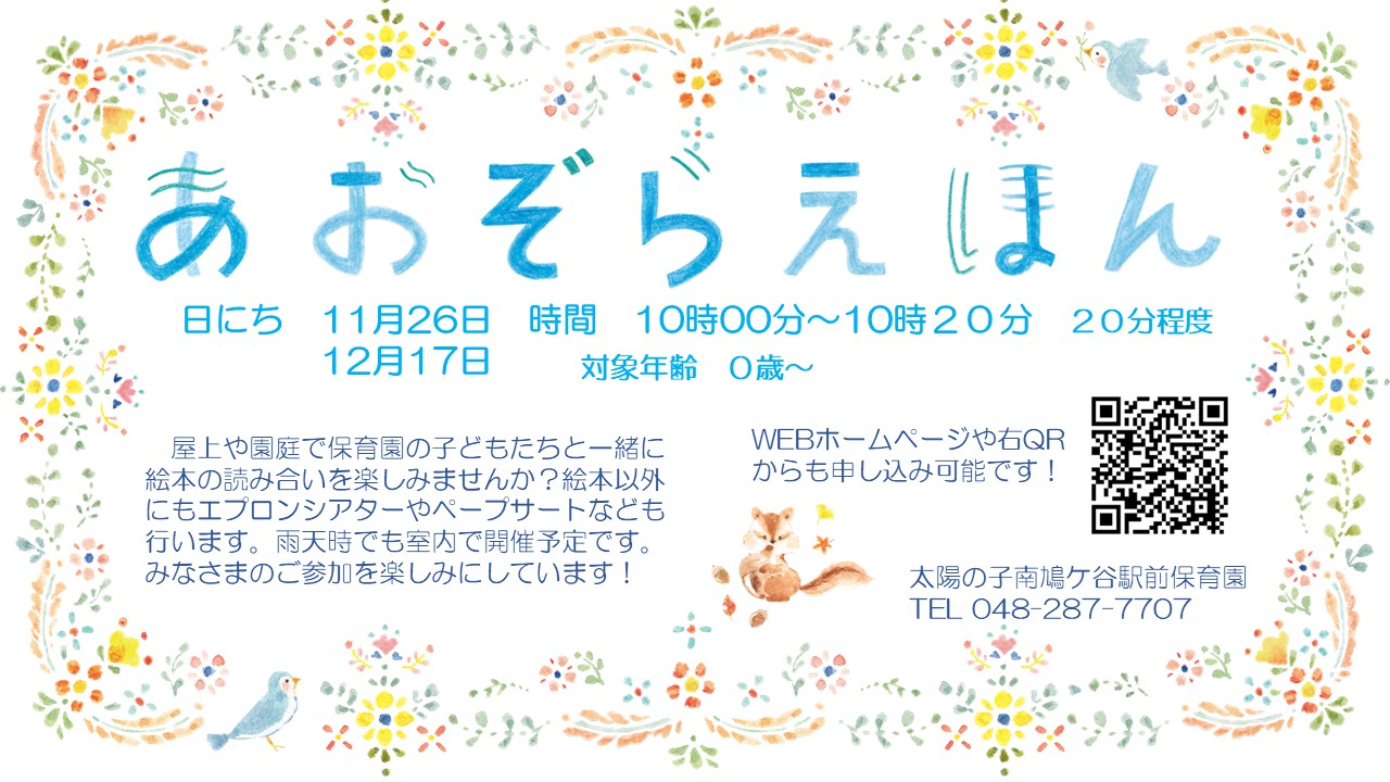 屋上や園庭など開放された外の環境で子どもたちと一緒に絵本の読み合いをしてみませんか?11月26日(水)と12月17日(水)に活動します。雨天時でも室内で開催いたします!ご応募お待ちしております。