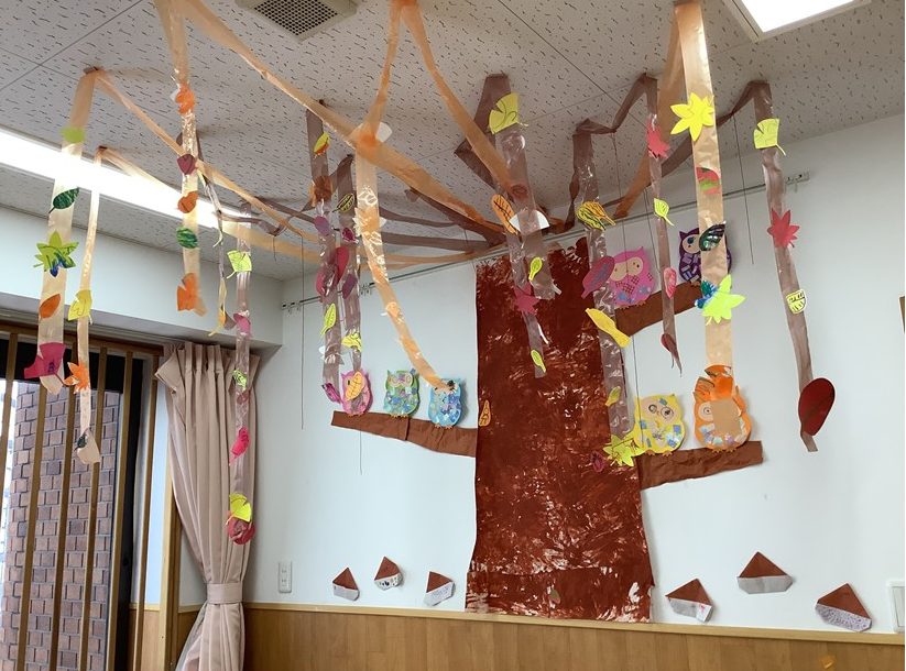 秋の雰囲気を感じられるような落ち葉やフクロウ、折り紙で栗を折ったりと日々の制作を思い思いに飾りつけをしています👀✨