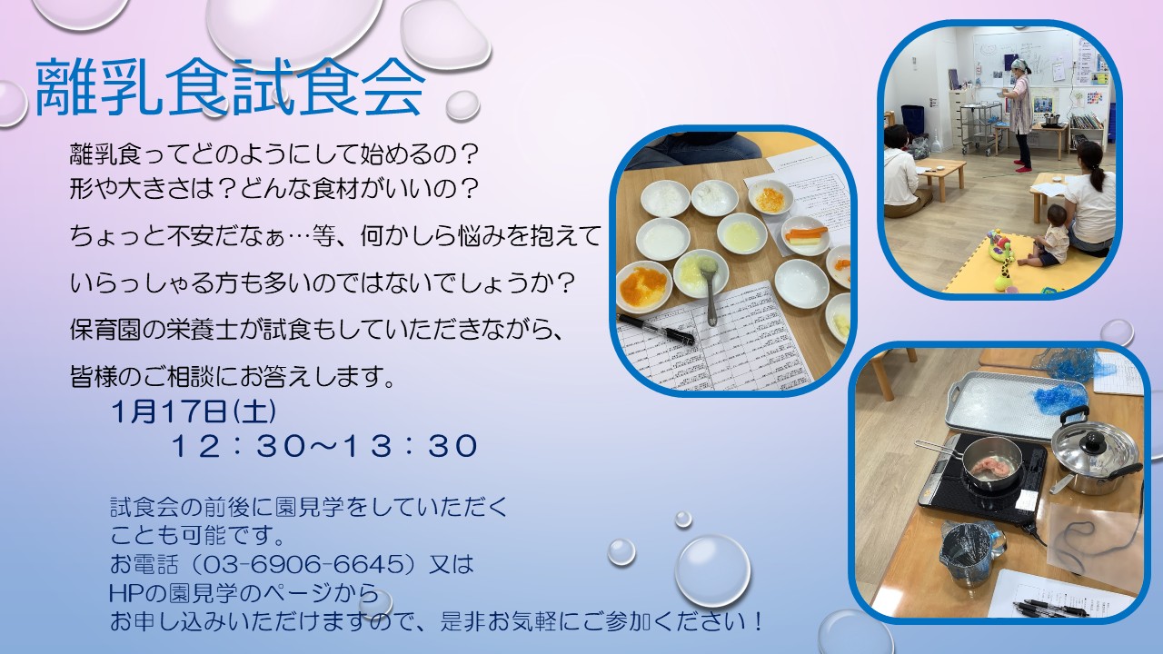 • 離乳食試食会 1月17日(土)12:30~13:30(これから離乳食を進めていく保護者の方、離乳食について相談のある方等、是非ご参加ください。) また、出産を迎える方の体験学習(妊娠中~産後4カ月頃まで)は随時受付中! 0歳児クラスに実際に入って、子ども達と過ごしていただきます。 お気軽にお電話ください。