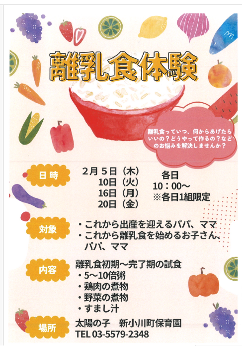 離乳食っていつから始めるの?何から始めるの?どうやって作るの?そんなお悩みを栄養士が解決いたします。これから出産を迎えるパパママ、これから離乳食を始めるご家庭の参加をお待ちしております!初期食から完了食まで試食もあります。園イベント申し込み画面からお申し込みください。